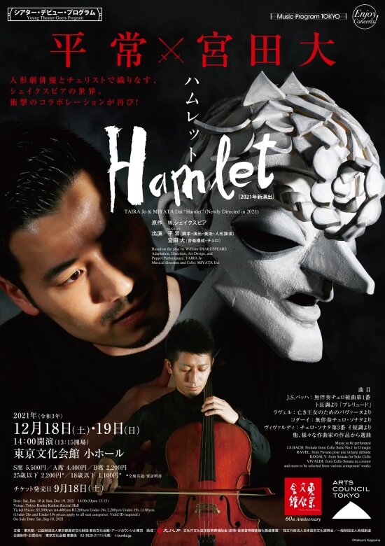 本日、東京文化会館小ホールで、一人芝居と人形劇を融合させたオリジナル表現様式を持つスーパー・パフォーマー、平常さんの脚本、演出、美術、人形操作、台詞、そして、チェロ界のホープ、宮田大さんの音楽による、目の覚めるような舞台演劇「Hamlet ハムレット」を拝見してまいりました。平常さんお一人で上記すべてをトータルとして担当なさり、思いも及ばぬ人形操作、アイディアに満ちた演出によって、観る者の度肝を抜く舞台をつくりあげる方で、その手腕は、昨年の「400歳のカストラート」でとくと拝見してびっくりいたしておりました。 今回は2016年のプロダクションの刈込再演出とのこと、お手並みはまた一段と冴えて、シェイクスピア戯曲のなかでもっとも長編作である本作を、休憩含め2時間半で誰にでもわかりやすく、かつ感動的に表現なさいました。その平さんの固定化されない舞台進行に合わせて、こちらもたったお一人のチェロで、あの「ハムレット」のすべての場面の音楽を実現された宮田大さんの力量がこれまた並外れたもの。バッハの無伴奏組曲第番のプレリュードから始まって、ブルッフの「コル・ニドライ」、プロコフィエフの「行進曲」、イザイの無伴奏ソナタ、ヴィヴァルディの「四季」より「夏」、コダーイの無伴奏ソナタなどが縦横に駆使されました。