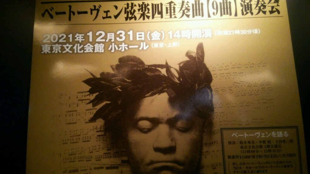 大晦日の本日、ミューザ川崎のシルヴェスター・コンサート、東京文化会館小ホールの「ベートーヴェン弦楽四重奏曲9曲」(途中の大フーガから)の2つのコンサートを拝聴し、すぐお隣の大ホールの「ベートーヴェン交響曲全曲演奏会」の賑わいぶりを横目で眺めながら帰途に就きました。