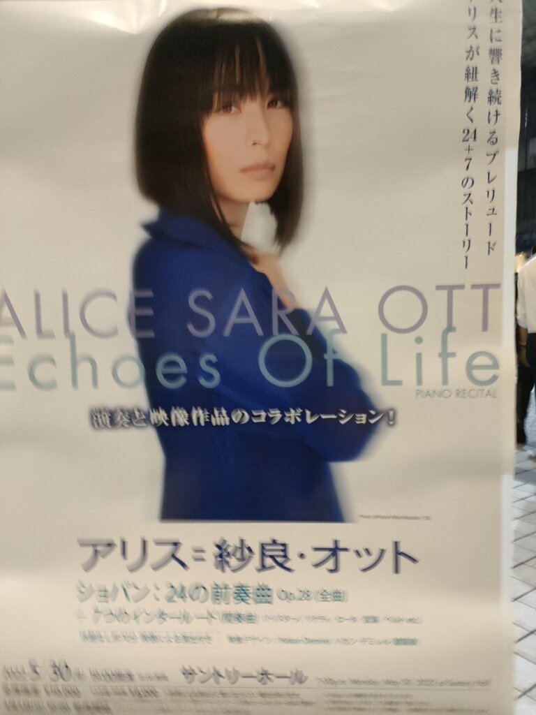 アリス=紗良・オットさんがコロナ禍に遭遇なさった中で悩まれた末に手探りで到達なさったのは、オットさんがもっとも心を惹かれる現代作品を、ショパンの『前奏曲集』作品28の随所に織り込み、それに映像をコラボレーションさせた「ECHOES OF LIFE」と名づけたリサイタル・プログラムでした。本夕はそれを、サントリーホールで拝聴してまいりました。