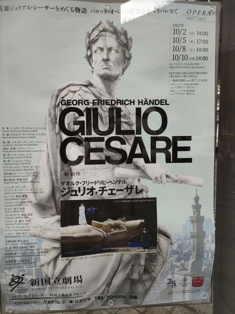 この秋のわが国オペラシーズンの開幕を告げる、新国立劇場の新制作、ヘンデル作曲のバロック・オペラ『ジュリオ・チェザーレ』を、本日、拝見してまいりました。ローマからエジプトに出向いた英雄ジュリオ・チェザーレ(ジュリアス・シーザー)が、エジプト女王クレオパトラと恋に落ち、困難の末に結ばれる物語ですが、全ての出演者が適材適所でした。