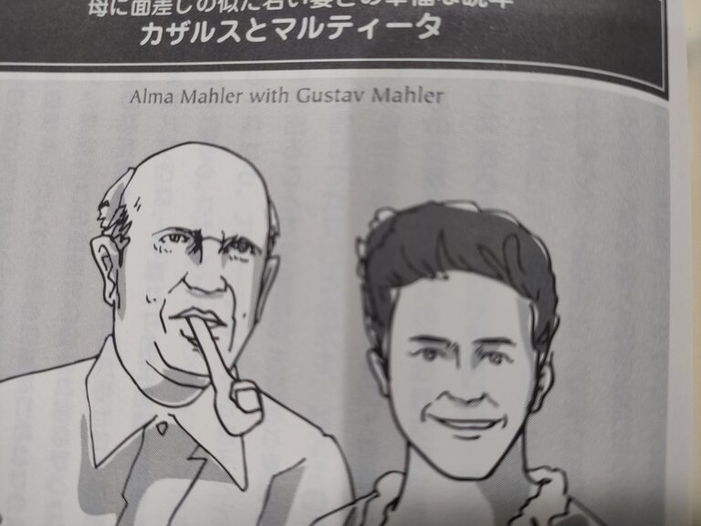 2日連続で「コルトー=ティボー=カザルス トリオ」に関して書かせていただいたのは、わたくしの中で、この3名の方々に関するやむにやまれぬ希求があったからだと気づきました。とりわけ、マエストロ・カザルスに関しましては、2007年6月10日にヤマハ・ミュージックメディアから上梓した拙著『音楽家カップル面白雑学事典』の中に、マエストロ・カザルスと彼の晩年の妻・マルティータさんのロマンスを詳しくご紹介させていただいたこともあって、マエストロ・カザルスがどのような思いで演奏活動、就中、トリオの活動を継続されたのか、あらためて知りたく思い、録音作品にも必死で耳を傾け、講師の先生方のお話も懸命に拝聴いたしました次第でございます。こちらは遠藤賢一画伯が描いてくださった拙著の口絵でございます。