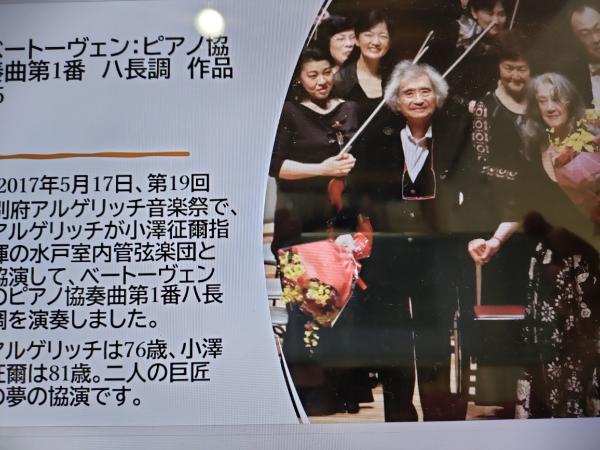 2012年から講師を務めさせていただいている、千代田区かがやき大学のクラシック音楽講座の今年度後期シリーズでは「女性音楽家の作品と演奏」のタイトルで、女性作曲家、及び女性演奏家のお話をして、作品、あるいは演奏を聴いております。本日は、1941年生まれ、現役女性ピアニストの長老格、今なお、エネルギーに満ちた演奏でわたくしたちを魅了する、マルタ・アルゲリッチさんを採り上げ、キーシンさんと協演したモーツァルトの「4手のためのソナタ」(2003年)と、小澤征爾指揮水戸室内管弦楽団との、ベートーヴェン:ピアノ協奏曲第1番ハ長調(2017年)を鑑賞いたしました。