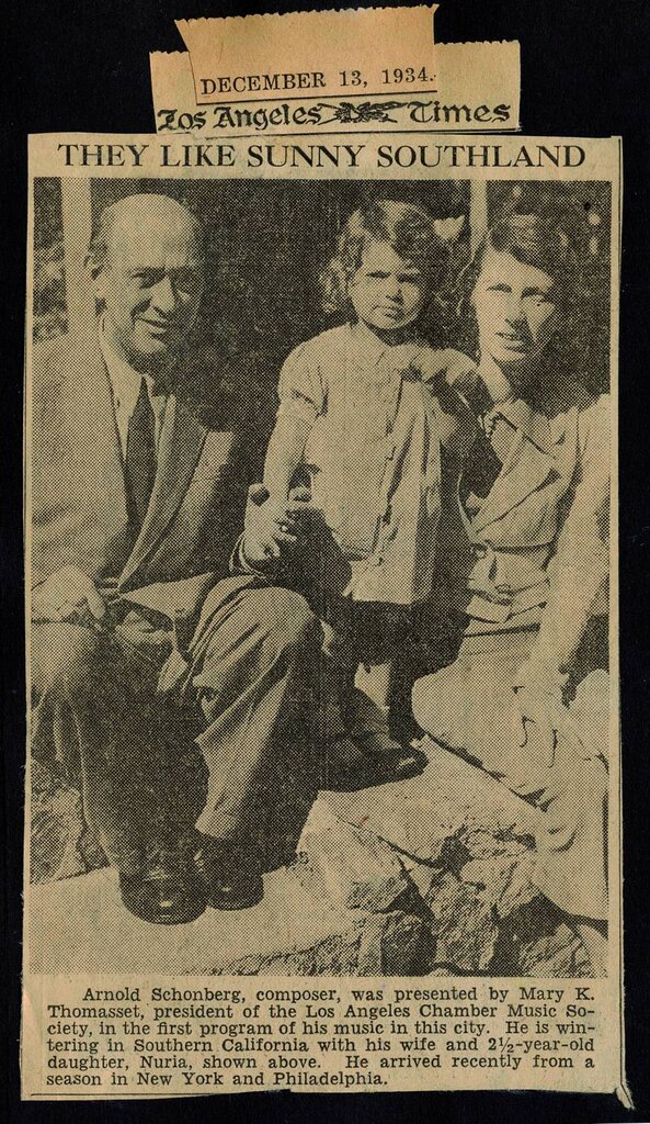 当初は東海岸に住んで、ボストンとニューヨークのモールキン音楽院で音楽理論と作曲を教えていましたが、34年の9月にロスアンゼルスに移り、51年7月13日に没するまで同地で暮らし、二度とドイツに戻ることはありませんでした。ロサスアンゼルス移住後の37年に、男の子ロナルド・ルドルフさんが生まれ、41年にもう一人の男児で今回被災された、ローレンス・アダムさんが生まれています。