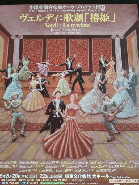3月20日、東京文化会館で開催された、小澤征爾音楽塾のオペラ公演、ヴェルディ『椿姫』を拝見しました。主役3人と、ヴィオレッタの親友フローラ、アルフレードをヴィオレッタに引き合わせたガストン子爵に外国人歌手を招き、その他は日本人歌手というキャストです。管弦楽と合唱団が、小澤征爾音楽塾に学んだ方たち。指揮は小澤征爾音楽塾首席指揮者のディエゴ・マテウスさんです。