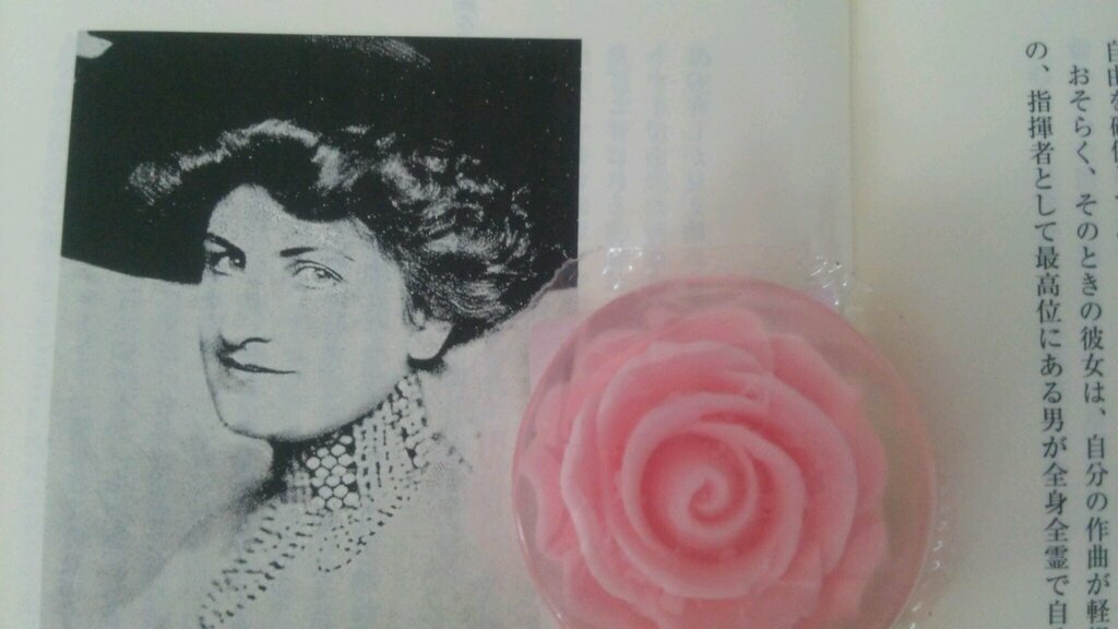 実は、7月7日はグスタフ・マーラーのお誕生日。とりあえず、彼の妻アルマと、薔薇の石鹸の写真をアップして今日の記事といたします。このアルマの肖像画は、わたくしが2002年に上梓した、初の単著『五線譜の薔薇』に採り上げた、アルマ・マーラーの章の口絵です。ピンクの薔薇は、ごく最近に、この拙著を読まれて共感してくださった、読者の方からのプレゼントです。