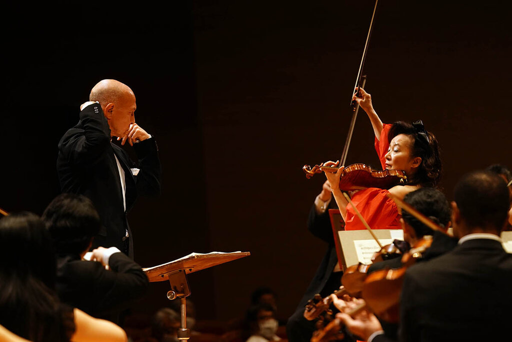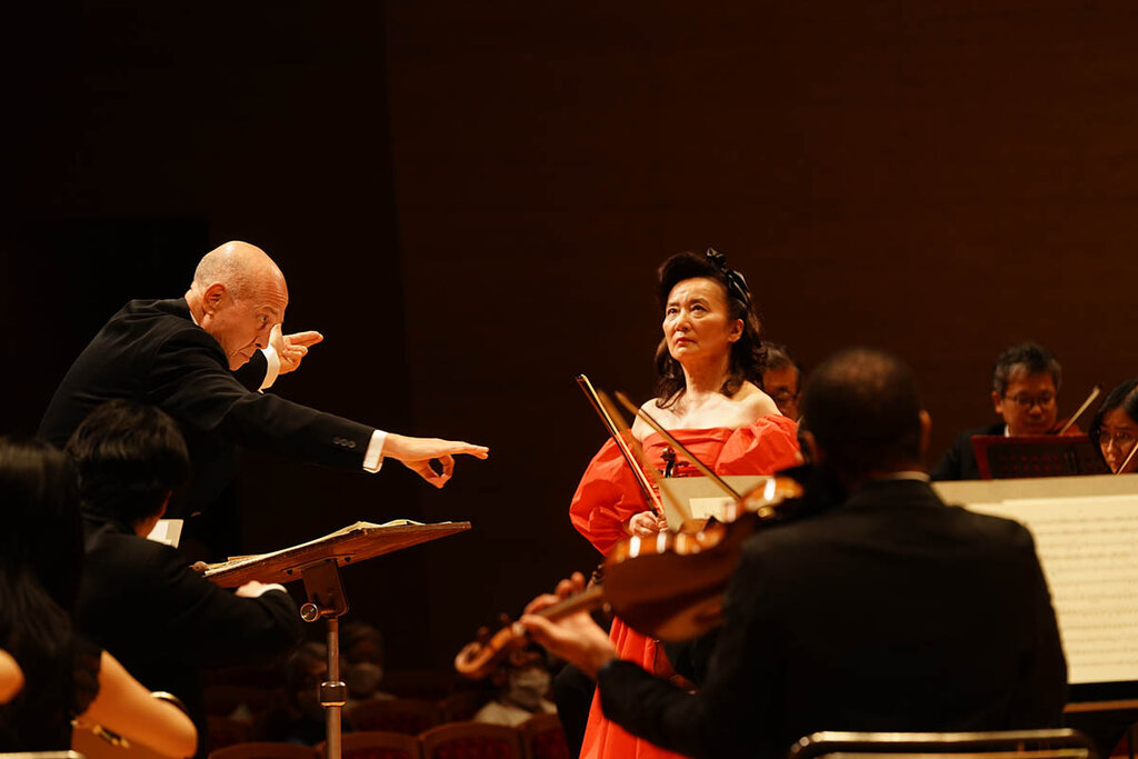 そして、これまた最高にリッチなお魚料理は、ヴァイオリン協奏曲の王様、ベートーヴェンの協奏曲です。井上道義マエストロがエスコートしてきたのは、目の覚めるような深紅のドレスに身を包んだ前橋汀子さん。曲にふさわしい女王の貫禄です。長いオーケストラ呈示部の間、体でリズムをとりながら曲に入っていき、いよいよソロの出を迎えると輝かしい第一音からぐいぐいと聴衆を惹きつけます。