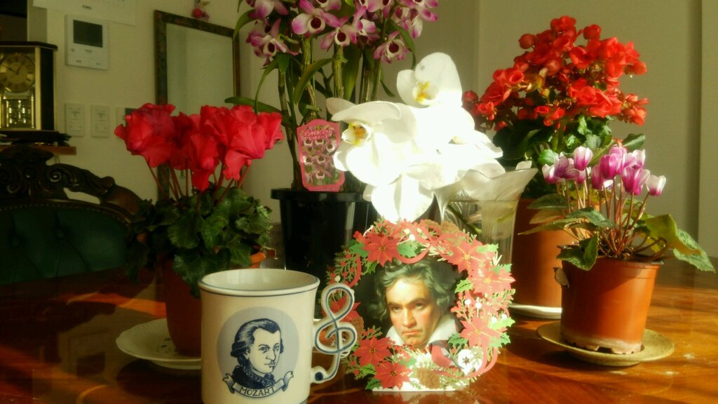 というわけで、二大楽聖を、お世話が行き届かないのに健気に咲き誇ってくださっているお花様たちで囲んで、記念写真を撮りました。